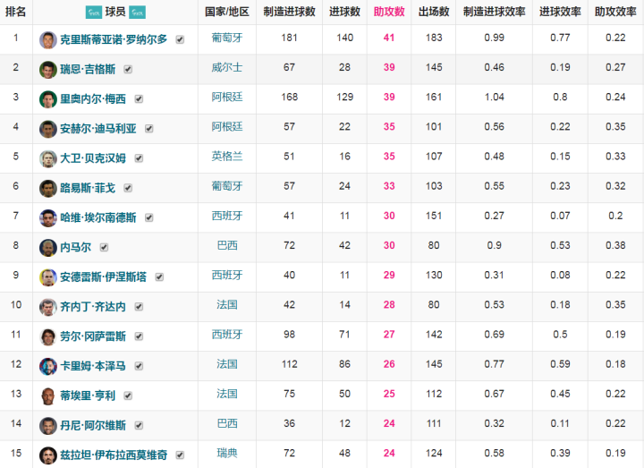 现役球员中,除了上述几位排名最高的是今年的金球奖得主本泽马,他以26次助攻排名历史第12名。