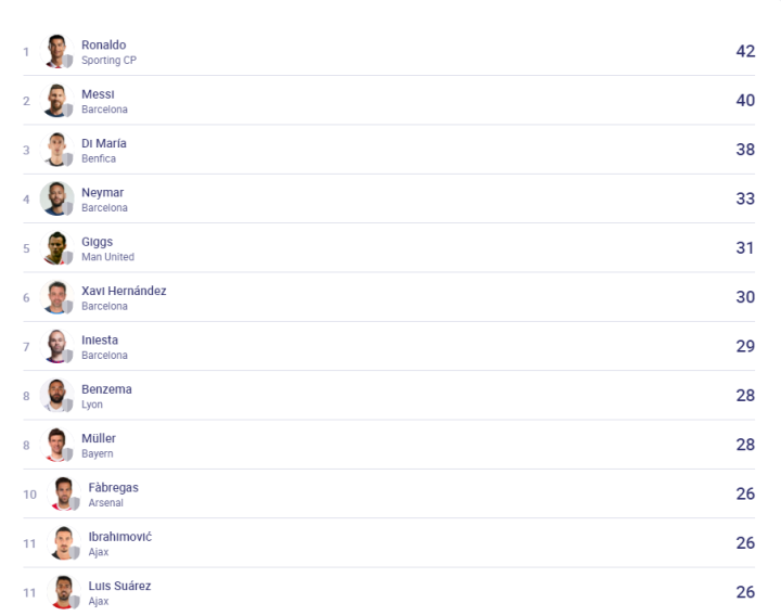 最后,我找到了欧足联官网上的欧冠历史助攻榜: