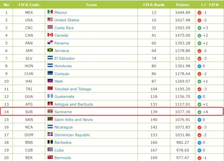 (图)新一期的FIFA排名,苏里南仅列139位(中北美第14)