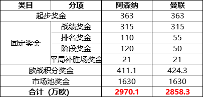 根据上述规则,起步奖金和固定奖金不难算出,这里就不作详述。欧战积分奖金,因为曼联和阿森纳分别是本届欧联里欧战排名第1和第2的球队,因此分别获得了32份和31份奖金。市场池部分奖金数据来源Swiss Ramble。