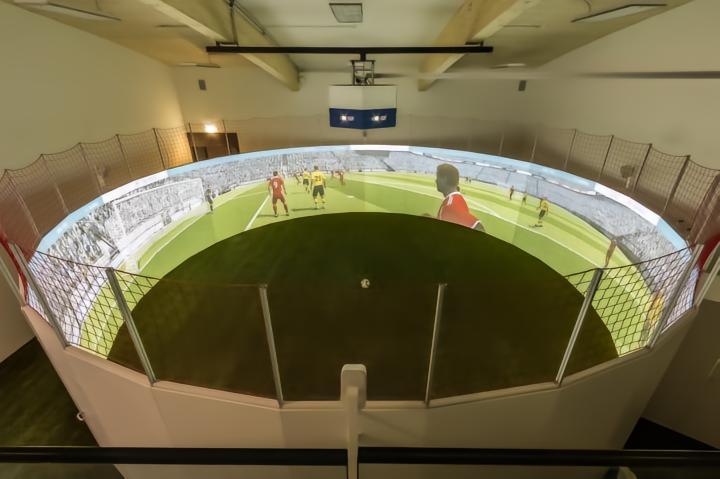 “足球机器人是一个80平米,360度的比赛空间,每次最多可以容纳四名球员,球员们可以在各种挑战中将球踢向墙壁通关。这是一套基于摄像头的系统,以每秒120帧的速度跟踪球员们。”