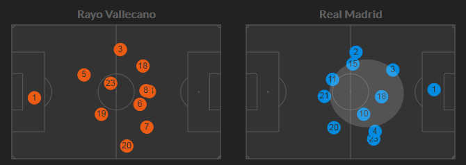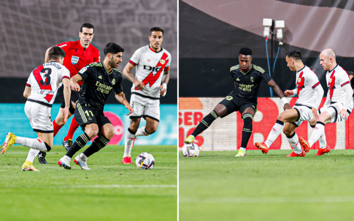 巴列卡诺体能充沛,高位压迫也很有侧重点,即依托边线进行施压,目的就是限制维尼修斯和F-巴尔韦德的起速。缺少前场轴心(本泽马),两翼的控球能力不均衡,皇马的大部队很容易被分割包围。