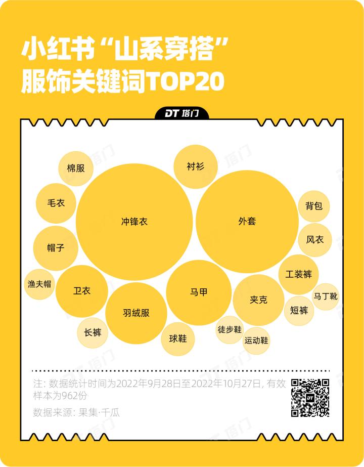 DT财经统计了小红书“山系穿搭”相关笔记提到的服装配饰,冲锋衣是被提及频次最高的山系搭配。另外,工装裤、渔夫帽、马丁靴、徒步鞋等生活中也可以驾驭的轻户外元素也受到欢迎。