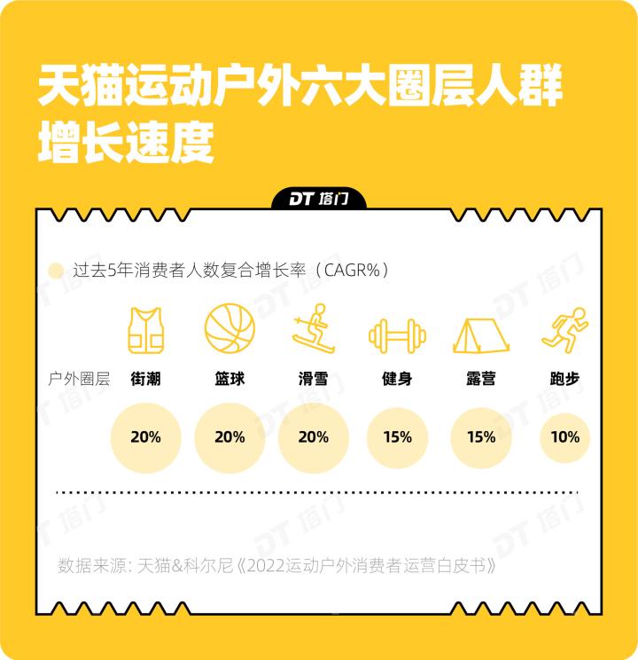 在今年发布的《运动户外消费者运营白皮书》中,天猫首次提出运动户外行业六大圈层人群。数据显示,过去5年户外街潮人群的复合增长率约20%,与篮球、滑雪并列第一。