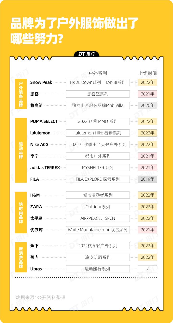 传统户外服装品牌玩起了轻户外,户外装备品牌、运动品牌、快时尚品牌、新消费品牌也纷纷推出山系穿搭。
