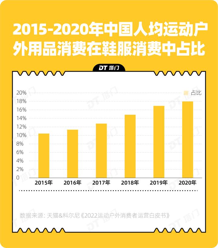 一项数据显示,2015年至2020年,中国人均运动户外用品消费在鞋服消费中的占比逐年提升。在露营、骑行、徒步等户外场景以外,都市户外风格已经融入到了通勤、逛街、出门等生活场景中,成为一种生活态度。