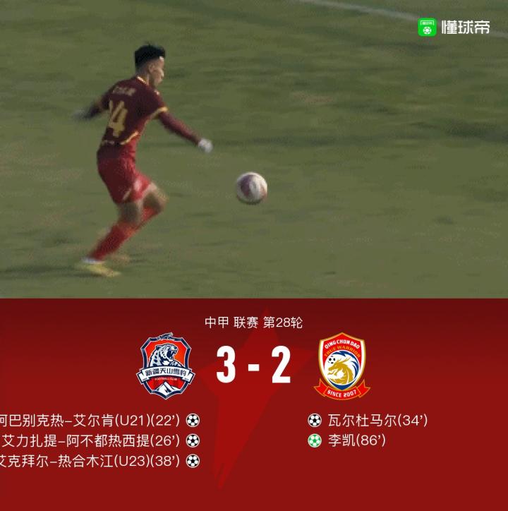 北京时间11月8日14:30,中甲第28轮比赛,新疆天山雪豹对阵青岛青春岛。上半场,阿巴别克热任意球直接破门,艾力扎提单刀破门扩大比分,瓦尔杜马尔扳回一城,艾克拜尔破门;下半场,李凯点射再扳一球,最终新疆3-2青春岛。