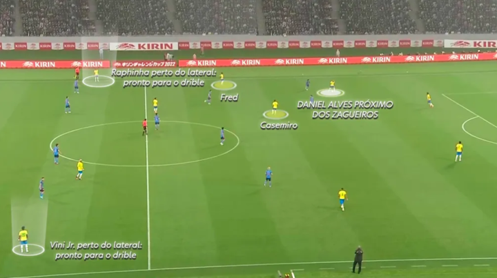 从下图可以清晰看出这种战术思路在场上呈现出的状态,拉菲尼亚和维尼修斯在两侧充分拉开了空间,他们可以在尽可能靠近对方防线的位置接球,而且能够无所顾忌地进行盘带。为了中路位置保证球队的整体结构,阿尔维斯会来到内线,同卡塞米罗、弗雷德一同配合处理球。