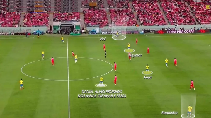 去内线踢球,阿尔维斯发掘了这种战术的潜力,因为他和内马尔、帕奎塔之间的联系非常密切,他会变成第三个控球中场。这一战术已经在2018年世界杯的备战周期中进行了探索,但阿尔维斯因伤落选世界杯。在2019年美洲杯上,他在整个杯赛中将这一战术发挥得淋漓尽致,这也是热苏斯打右路的决定性因素。那年美洲杯,阿尔维斯率队夺冠并且斩获赛事MVP。