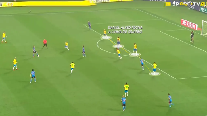 下图也是一个例子,阿尔维斯在中路的位置比卡塞米罗更靠前,接近弗雷德和内马尔。如果他从那里得到球,一次传球就可以制造得分机会。费尔南多-迪尼兹在圣保罗时期极致地使用了阿尔维斯这一特点,后者内收作为中场,踢得很不错。