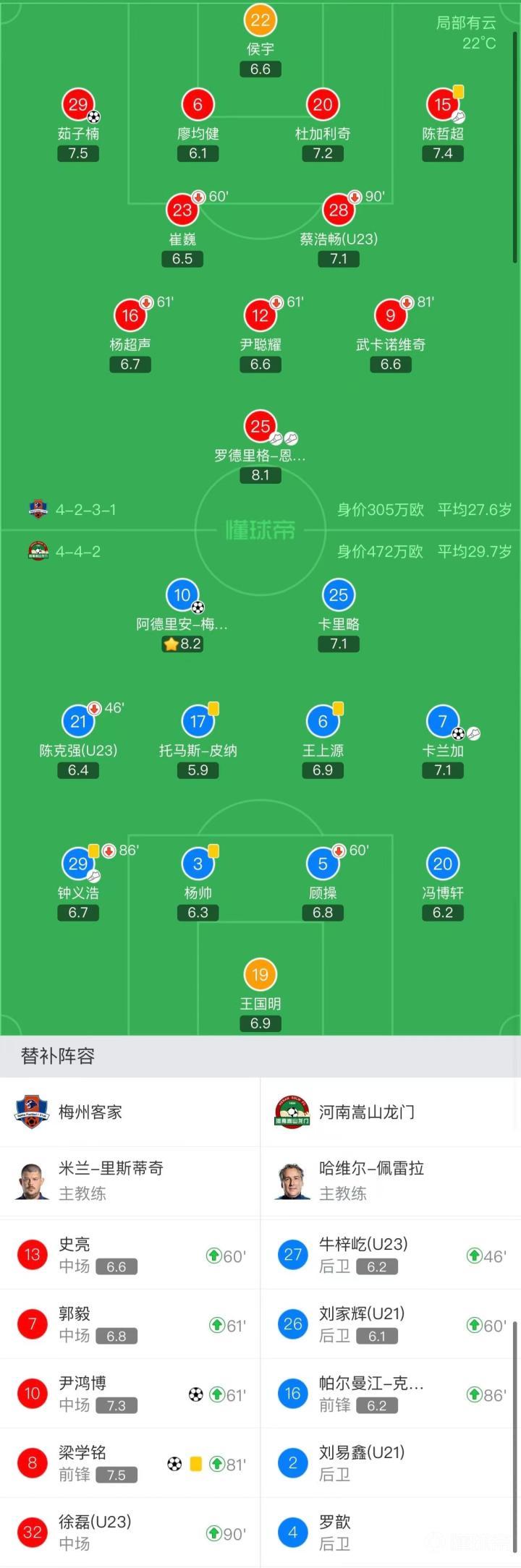 梅州客家首发:22-侯宇、6-廖均健、15-陈哲超、16-杨超声(61'7-郭毅)、20-杜加利奇、23-崔巍(60'13-史亮)、25-罗德里格-恩里克、28-蔡浩畅(U23)(90'32-徐磊(U23))、29-茹子楠、12-尹聪耀(61'10-尹鸿博)、9-武卡诺维奇(81'8-梁学铭)