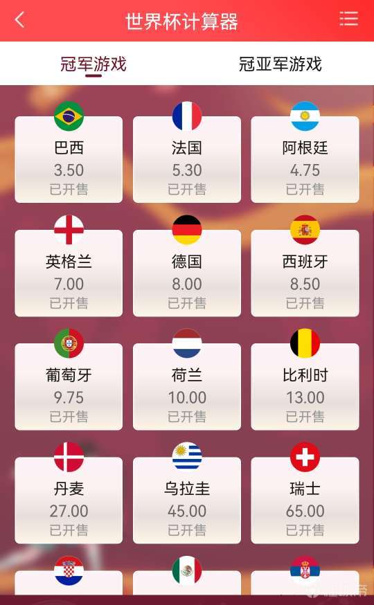 历届世界杯冠军赔率及最终夺冠球队2022年赔率第...tiger吴 @懂球帝2022-11-08 21:41历届世界杯冠军赔率及最终夺冠球队 2022年赔率第一巴西,夺冠球队? 2018年赔率第一德国,夺冠球队法国 2014年赔率第一巴西,夺冠球队德国 2010年赔率第一西班牙,夺冠球队西班牙 2006年赔率第一巴西,夺冠球队意大利展开更多