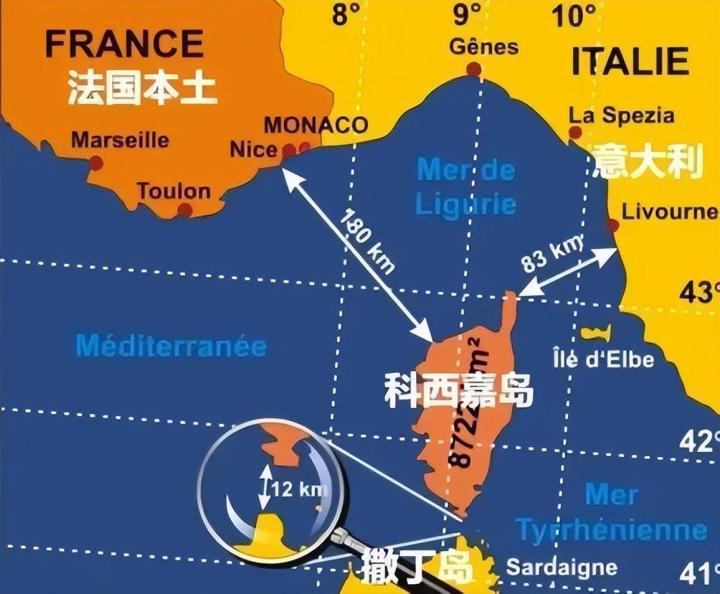 科西嘉岛距法国大陆约180公里,距离意大利半岛只有83公里,距离地中海第二大岛撒丁岛(意大利)的距离只有12公里。