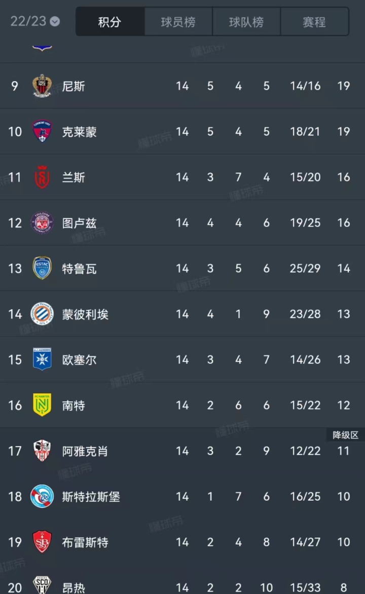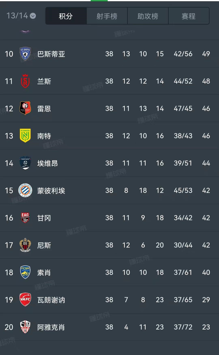 目前阿雅克肖俱乐部以3胜2平9负积11分排名法甲第17位。因为下赛季法甲联赛要缩减名额(升2降4)。这个排名不足以让他们留在本赛季的法甲联赛。
