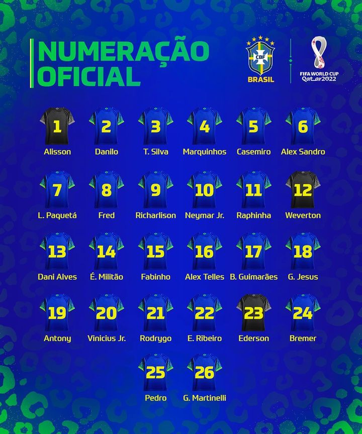爱奇艺体育北京时间11月9日,巴西国家队官方公布了各球员的球衣号码,内马尔身披10号,热苏斯18号。
