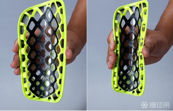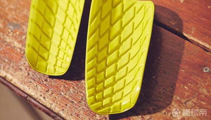 然后是Nike刺客护腿板的核心技术体现,而这里先为大家打来护腿板的板面材质详解。抛开基础款的护腿板版本不谈,Mercurial Lite是业余球场上使用比较多,价格比较亲民,发布量最大,性价比最高的一个版本。这款Mercurial Lite护腿板的板面材质就是采用普通柔化过的TPU材质,这里没有什么可以吹的,板面做成了弯曲形状以适应使用者的腿型,总体包裹性尚好,但是这种材质没有什么延展性,Lite版本的护腿板无法柔软的弯曲。然而做成这样,考虑到板面的厚度异常厚实,接近了1厘米的厚度,对双腿的保护性非常好,也算是对得起价格了!