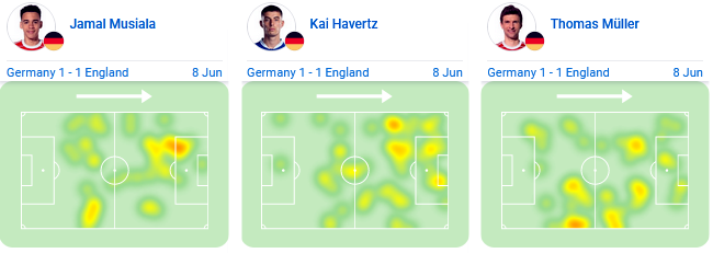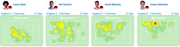 弗里克的球队看似并不缺少得分手,维尔纳、托马斯-穆勒、罗伊斯和格雷茨卡等人都有着不错的数据。维尔纳是弗里克任内出场次数最多的锋将(13次首发,2次替补),941分钟内收获了8球2助攻,成为队内制造进球最多的球员。维尔纳的8球分布在6场比赛里,客场对阵北马其顿以及主场大胜意大利时都有梅开二度的表现。作为能够小范围内运用盘带和传威胁球制造杀机的球员,罗伊斯在弗里克麾下取得7粒进球,近一年来每35分钟便制造1球(2球5助攻)的效率十分惊人。