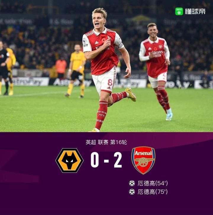 阿森纳2-0狼队5分优势领跑,厄德高双响,法比奥-维埃拉助攻