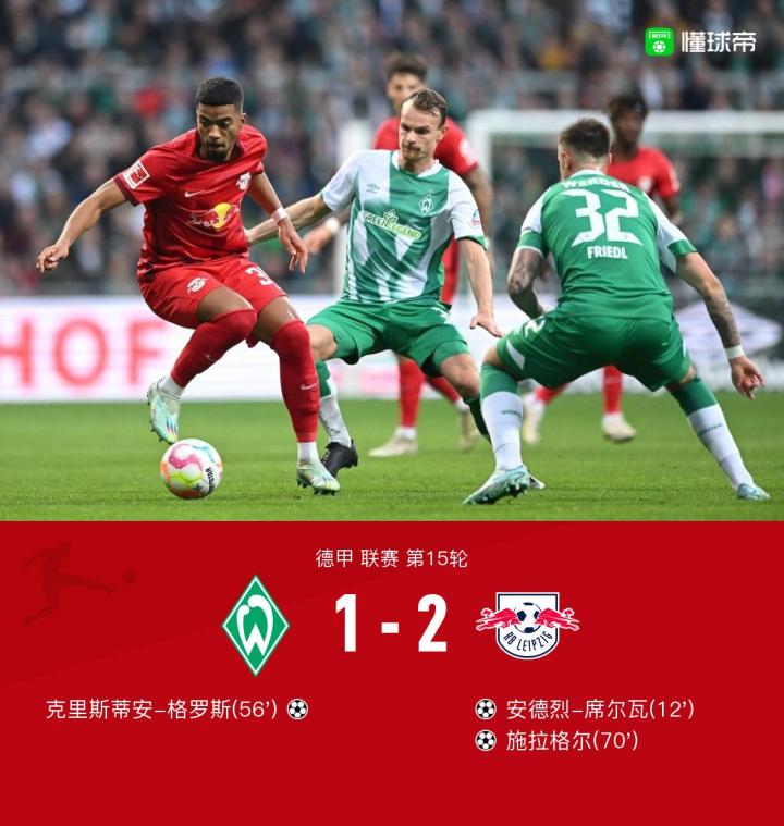 莱比锡2-1不莱梅迎联赛4连胜,A席传射,施拉格尔推射建功