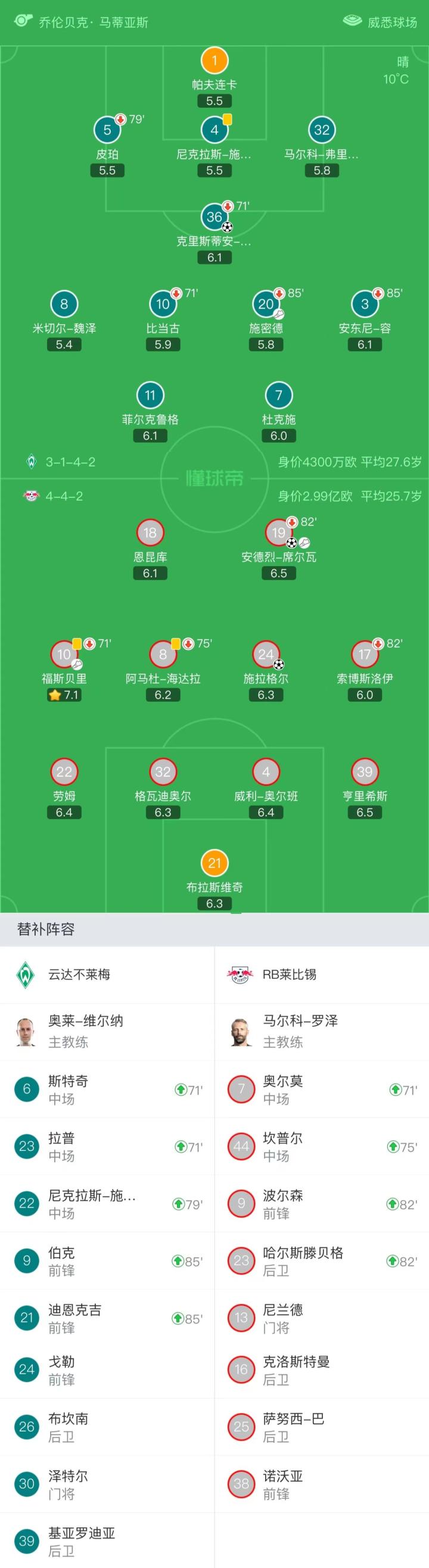 莱比锡首发:21-布拉斯维奇、4-威利-奥尔班、8-阿马杜-海达拉(75'44-坎普尔)、10-福斯贝里(71'7-奥尔莫)、17-索博斯洛伊(82'23-哈尔斯滕贝格)、18-恩昆库、19-安德烈-席尔瓦(82'9-波尔森)、22-劳姆、24-施拉格尔、32-格瓦迪奥尔、39-亨里希斯