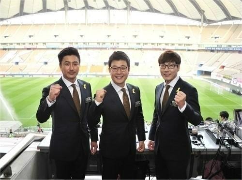 在解说席,金成柱(中)依旧是安贞桓(左)的好搭档