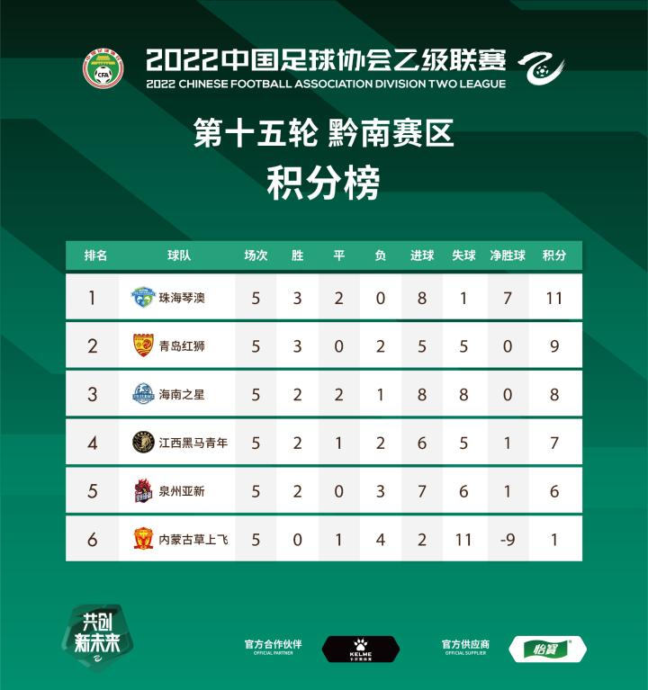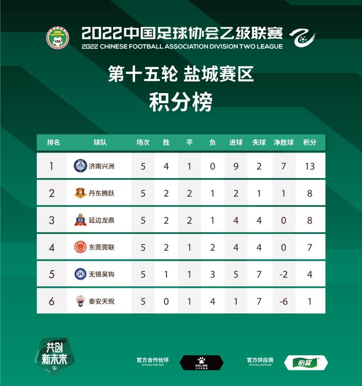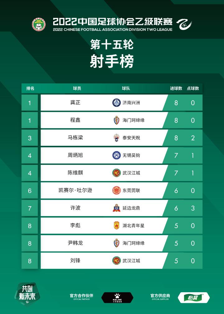 中乙落幕!最终积分榜公布,龚正程鑫领跑射手榜 11月13日下午,在如期完成所有场次比赛之后,2022赛季中乙联赛顺利落下帷幕,并成了中国足协旗下男足三级职业联赛最先完赛者。14日,中乙官方公布了各赛区的最终积分榜。 由豪华阵容组成的济南兴洲,如愿夺得冠军,连续两年夺冠升级,经过中乙一年的磨练之后,下赛季,他们将在中甲赛场,继续打拼。 来自东北的2支球队丹东腾跃、延边龙鼎,经过两年的锻炼,以黑马姿态完成冲甲。 保级组中,内蒙古草上飞、湖南湘涛不幸降级。本赛季从中冠晋级中乙的8支升班马,则悉数完成了保级。 射手榜上,来自济南兴洲的龚正、海门珂缔缘的程鑫,以及泰安天贶的马栋梁,都斩获了8个进球,位居三甲。其中,龚正、程鑫的8个进球中,没有点球,所以并列位居榜首。
