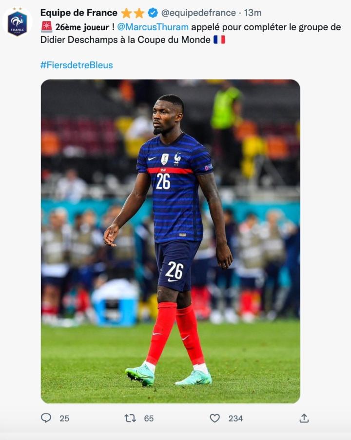 法国国家队在官方社交媒体上宣布:第26名球员!马库斯-图拉姆被征召入德尚的世界杯阵容。
