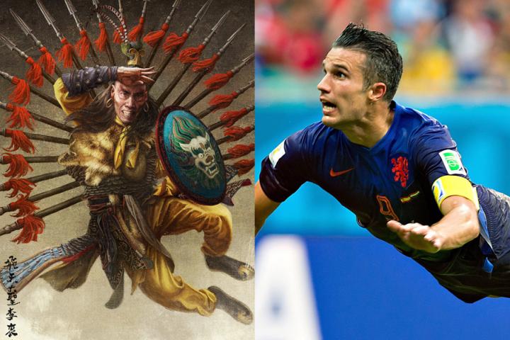范佩西,荷兰著名前锋。毫无疑问,称其为“飞天大圣”,是因为他打进了世界杯历史上最惊世骇俗的那个头球。2014年世界杯小组赛,荷兰队对阵卫冕冠军西班牙队。比赛第43分钟,队友布林左路拿球,刚过中线后观察到了范佩西的位置,于是45度角将球吊向对方禁区。场上球员和场下的球迷或许都在想,范佩西会怎么停球寻找机会或者凌空抽射。然而,范佩西在观察到对方门将的站位之后,用了一个任何人都没想到的方式,他直接鱼跃滑行,在刚过禁区线的位置将球直接顶进了对方的大门。此球堪称世界杯史上最经典的头球。凭借这个进球,范佩西让自己的名字永载世界杯史册。
