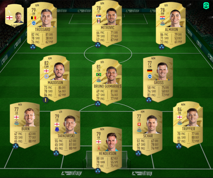 这是通过FIFA22给出的一个大概的阵容图,除了首发的球员替补席还有几位球员,这篇文章就先说一下首发11人吧。主帅的话埃迪豪我认为是没有悬念的,目前纽卡斯尔联的发挥让他上榜是肯定的。