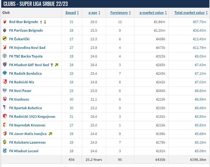 本赛季塞尔维亚超级联赛共计有16支球队,总身价约为1.98亿欧元,与本赛季的意甲球队萨索洛的总身价相当。其中身价最高的是国内联赛目前的绝对霸主红星,其目前的身价为5775万欧元。红星也是本赛季唯一身价超过4000万欧元的塞尔维亚球队。