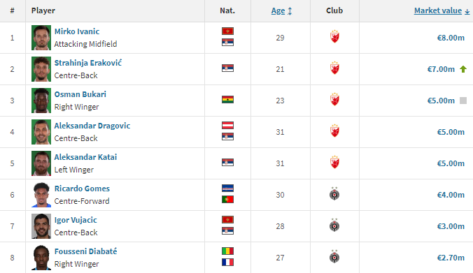 目前塞尔超联赛中没有球员的身价超过1000万欧元,其中身价最高的球员是黑山中场伊万尼奇,这位现效力于红星的29岁前腰目前的身价为800万欧元,而排名本赛季联赛球员身价榜前5名的都是红星俱乐部的球员,这五名球员也是联赛仅有的身价超过500万欧元的球员。