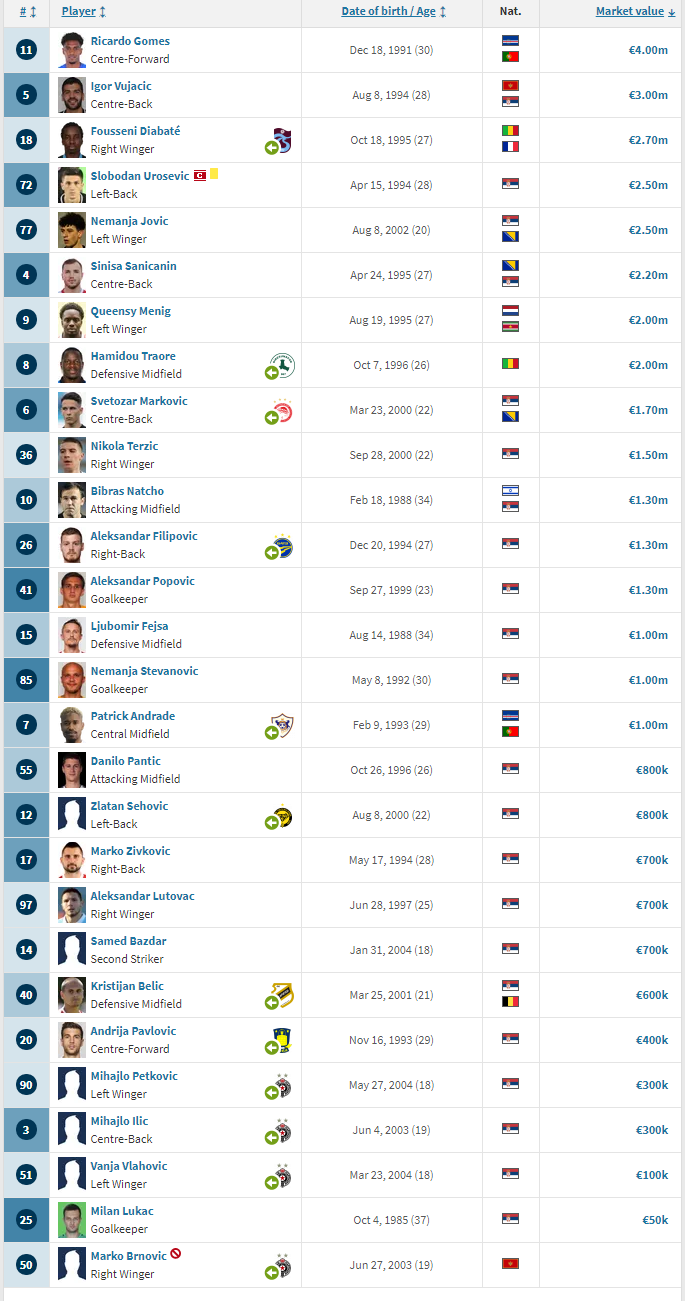 目前球队队长是本土球员乌罗舍维奇,这名28岁的后卫在约3年的时间里为球队出场182次,有16个进球和14次助攻的进攻数据。本赛季乌罗舍维奇在24场各项赛事中有6个进球和1次助攻的不俗表现,但其未能入选塞尔维亚国家队的世界杯大名单。