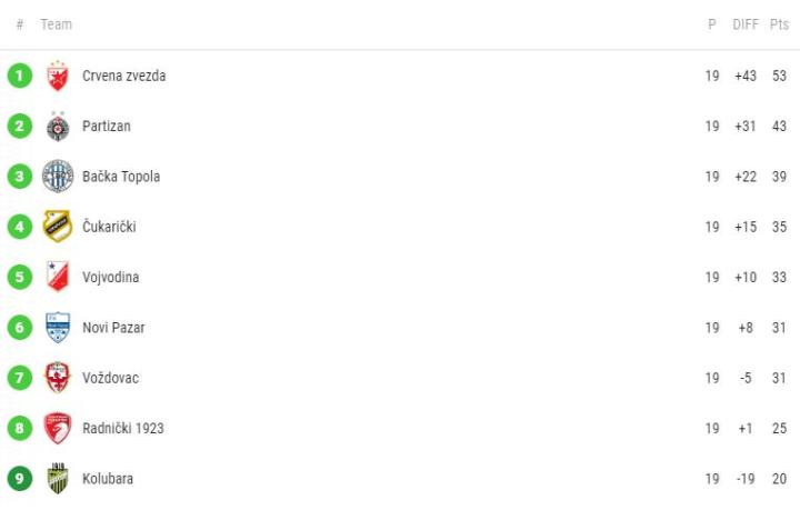 截至卡塔尔世界杯开幕前,塞尔维亚超的第一阶段已经结束了19轮的争夺,目前红星以10分优势遥遥领先,游击队和托波拉分列二、三位,两者相差4分。