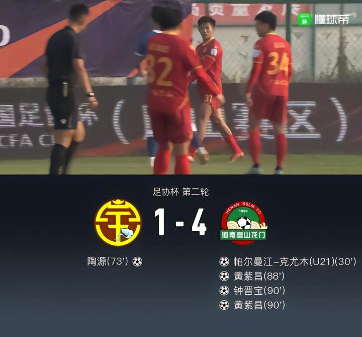 北京时间11月17日14:00,足协杯第二轮,河南嵩山龙门对阵广西平果哈嘹。上半场,帕尔曼江-克尤木内切小角度破门,陈克强远射打高。下半场,陈克强端射中框,帕尔曼江小角度打门被门将挡出,陶源扳平比分,黄紫昌替补双响,钟晋宝替补建功,最终,河南4-1广西。