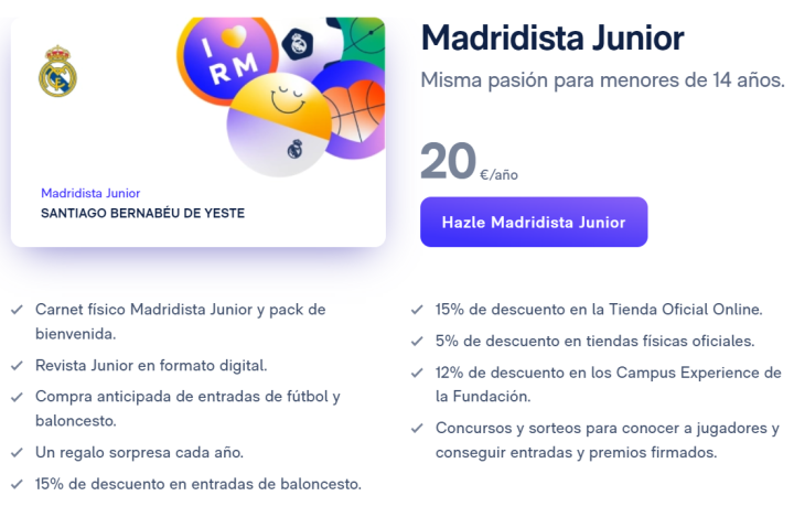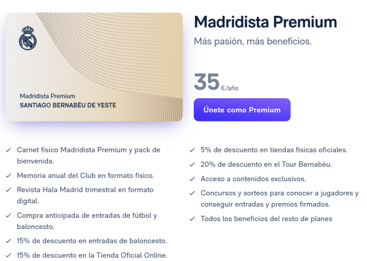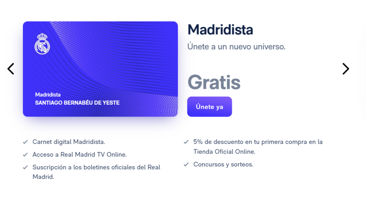 这张卡具有最基本的会员权益,可以访问皇马TV Online,订阅皇马官方消息推送,在官方商城首次购买可享受5%的折扣优惠。