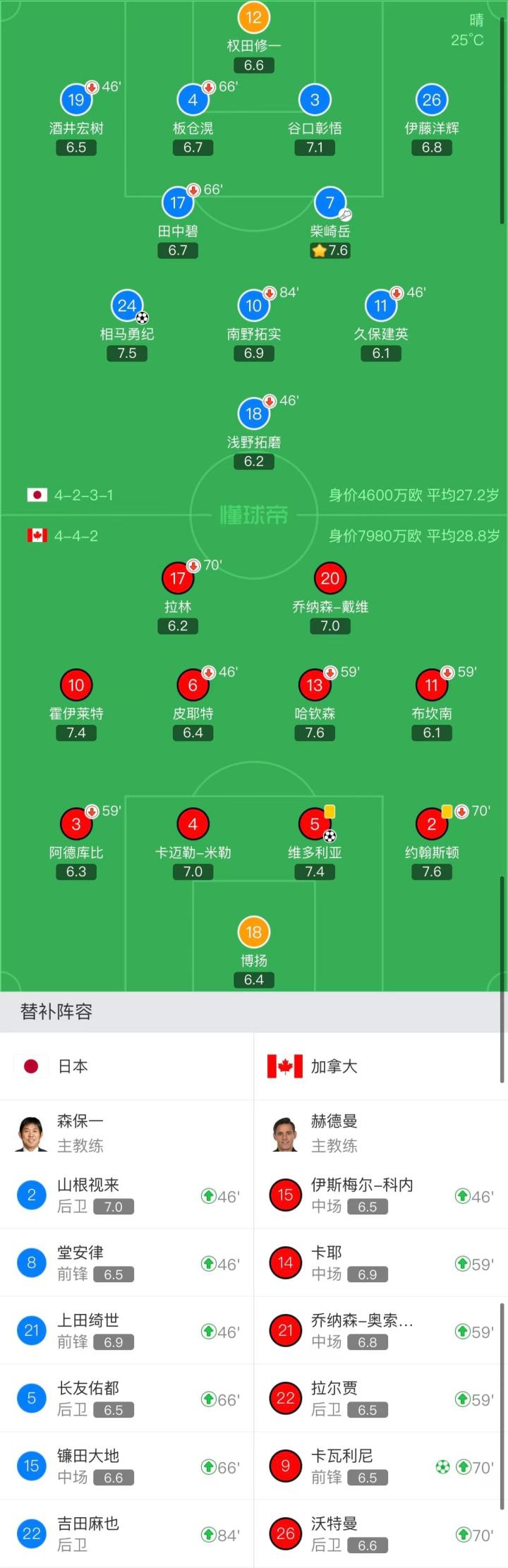 加拿大首发:18-博扬、3-阿德库比(59'21-乔纳森-奥索里奥)、2-约翰斯顿(70'9-卡瓦利尼)、5-维多利亚、4-卡迈勒-米勒、13-哈钦森(59'14-卡耶)、6-皮耶特(46'15-伊斯梅尔-科内)、11-布坎南(59'22-拉尔贾)、10-霍伊莱特、17-拉林(70'26-沃特曼)、20-乔纳森-戴维