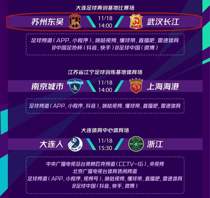 18日,足协杯将上演第二轮的最后3场比赛,分别是南京城市挑战上海海港、苏州东吴挑战武汉长江、大连人对阵浙江队。3场比赛,大连人与浙江队的比赛是中超内战,这也意味着第二轮比赛结束后,至少将有5支球队结束足协杯的征程。另外,苏州东吴与武汉长江的对阵可以说是暗藏冷门。目前,苏州东吴在中甲联赛中无欲无求,可以全身心投入足协杯比赛,而武汉长江在遭遇罚分后深受保级困扰,战略性放弃足协杯也并非没有可能,这场比赛将是第二轮3场比赛中的最大看点。