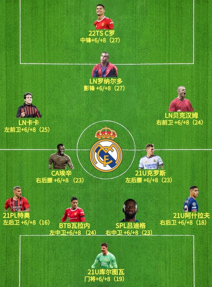 『 这里给出一套中高配置的皇马套,各位置球员及赛季的价格相对昂贵些。如果预算不充足,可以根据实际情况,来灵活调整,比如平民玩家可以用EBS C罗替代22TS,边路还能用FA卡卡、21U罗德里戈、EBS阿扎尔等,其他位置同理。 』