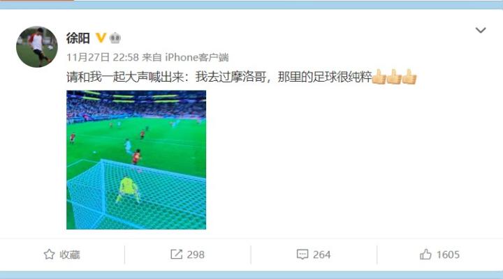 而在昨天摩洛哥爆冷击败比利时以后,徐阳再度玩起了自己4年前的梗:“请和我一起大声喊出来:我去过摩洛哥,那里的足球很纯粹!”
