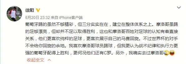 “葡萄牙踢的虽然不够精彩,但三分实实在在,建立在整体体系之上。摩洛哥虽踢的足够漂亮,但却并不足以取得胜利,这也和摩洛哥百姓对足球的认知有着直接关系,他们更喜欢纯粹的足球,更喜欢展示自己的马赛回旋。不过世界杯的对手不会给你回旋的余地。我喜欢摩洛哥球员踢球,但我更认为战术纪律和执行力更强的葡萄牙配得上胜利,更何况他们还有C罗。另外,我确实去过摩洛哥。”