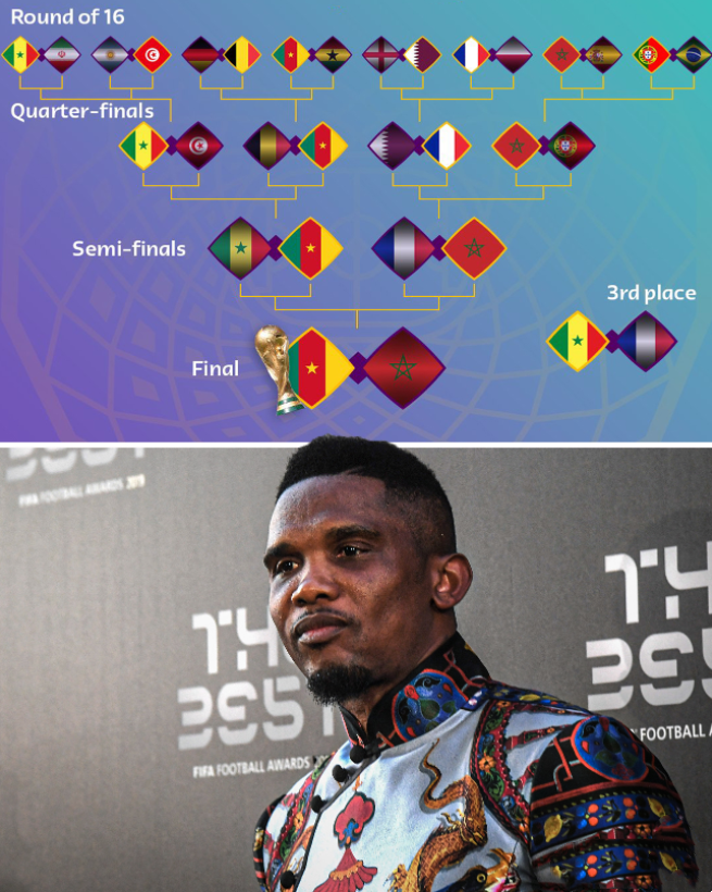 非洲著名球星埃托奥预测了本届世界杯的结果,他认为喀麦隆和摩洛哥会在世界杯的决赛相见。