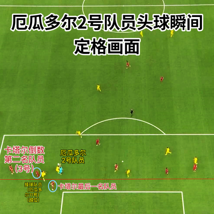 什么是越位位置?答:在对方半场内,且比对方倒数第二名防守队员和球更靠近球门。在厄瓜多尔2号头球瞬间,11号处在越位位置,此后11号回撤头球,所以无疑构成了越位犯规。