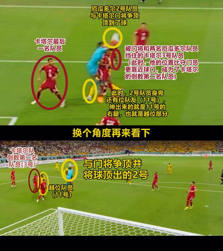 那么争议点来了——厄瓜多尔2号队员头球瞬间,怎么就能确认卡塔尔的倒数第二名队员是3号,而非守门员?其实从比赛的垂直角度能够看清,相比守门员,卡塔尔3号明显距离球门更近,所以他是倒数第二名队员,需要比较厄瓜多尔11号与他的位置关系。
