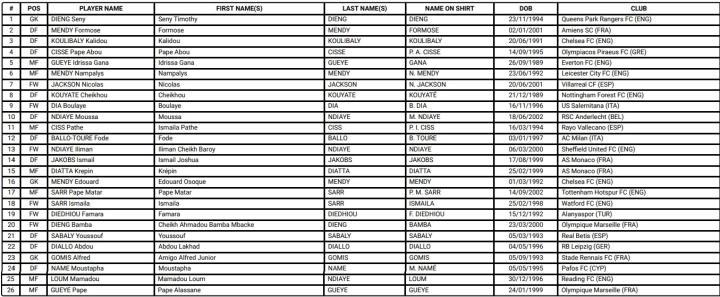 前锋:7-雅克松(比利亚雷亚尔)、9-布拉耶-迪亚(萨勒尼塔纳)、13-恩迪亚耶(谢菲尔德联)、18-伊斯梅拉-萨尔(沃特福德)、19-迪耶迪乌(阿拉尼亚体育)、20-班巴-迪昂(马赛)