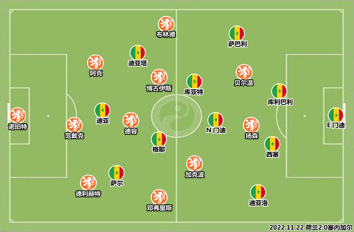 迪亚洛司职左后卫,塞内加尔以三中卫+三后腰建立的体格优势封锁后场,断球后直接给萨尔和迪亚塔创造一对一机会,持续向阿克和德利赫特施压。当第一波的攻势遇阻后,塞内加尔还可以通过小组配合,从禁区正面寻找机会,荷兰中场在对抗和拦截方面的表现是不合格的,博古伊斯难辞其咎。