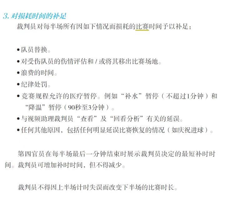 根据规则,每半场结束前的补时主要包括因换人、受伤、红黄牌、故意拖延、进球后庆祝、等待VAR回看等事件导致的时间损耗。第四官员示意的补时时长为最短时长,主裁可酌情延长,但不得减少。