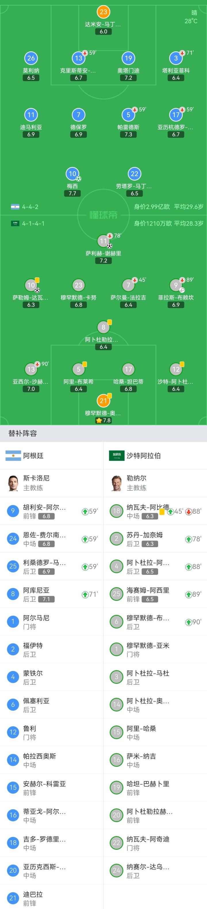 阿根廷首发:23-达米安-马丁内斯、26-莫利纳、19-奥塔门迪、13-克里斯蒂安-罗梅罗(58'25-利桑德罗-马丁内斯)、3-塔利亚菲科(70'8-阿库尼亚)、7-德保罗、5-帕雷德斯(58'24-恩佐-费尔南德斯)、17-亚历杭德罗-戈麦斯(58'9-胡利安-阿尔瓦雷斯)、11-迪马利亚、22-劳塔罗-马丁内斯、10-梅西