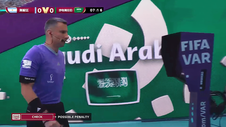 裁判圈在阿根廷与沙特比赛的第5分钟,阿根廷队角球开出后帕雷德斯后被对手抱摔放倒,当值主裁斯拉夫科·温契奇没有判罚犯规,随后在下一次死球时VAR介入并建议裁判员进行场边回看,温契奇亲自回看后判罚点球。