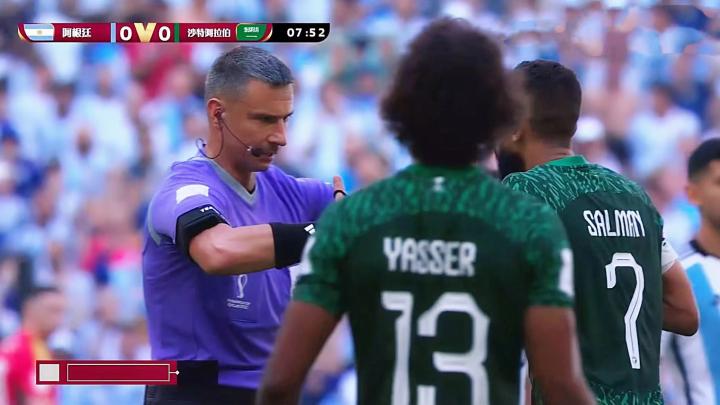 伤停补时期间同样充满争议。第90分钟,阿根廷队员争顶时明显冲撞门将犯规在先,温契奇没有吹罚犯规,随后直到进攻结束才补判越位,导致沙特门将“破防”,向裁判抗议,被黄牌警告。