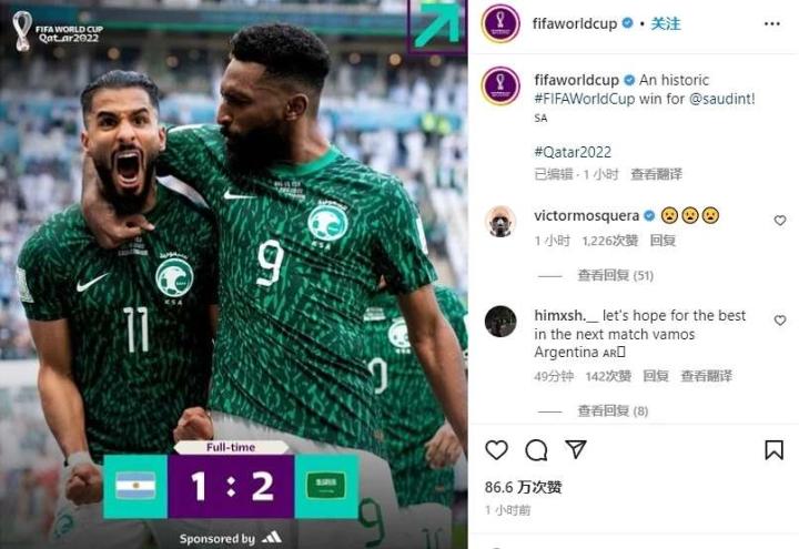 世界杯官方晒沙特2-1阿根廷的比赛结果:“这是一...